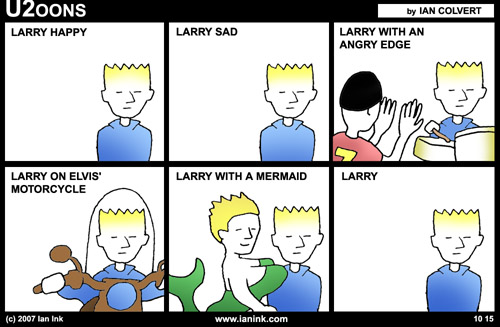 If Larry were to crack a smile, all his youth would suddenly fade away and his real age would show; he’s afraid to move his face, lest the guise be broken. Great work, Ian!