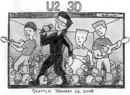 This U2oon can be yours! This one of a kind, hand drawn sloppy pencil and ink U2oon — devoid of all computer trickery — can be won by a lucky folk attending the Seattle U2 3D @U2 shindig, Saturday, January 26th. I hope to see you there!