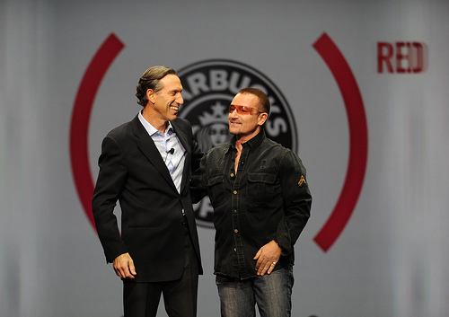 Bono was there to support the new partnership between (RED) and Starbucks during the holiday season. The article quotes Starbucks SVP Michelle Gass: “If every single Starbucks customer bought one (RED) Holiday Exclusive (beverage) for a week, we would save 15,000 lives for a year in Africa.”