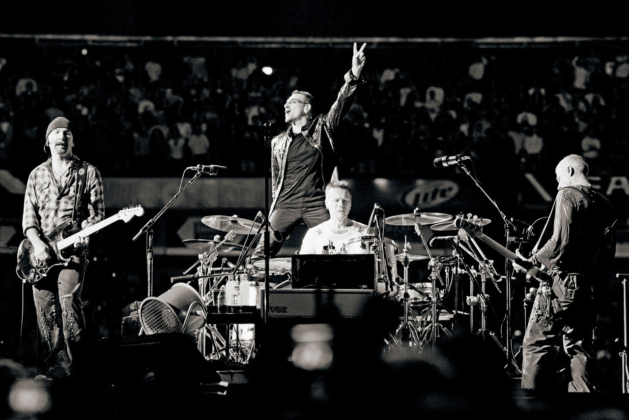 First, here’s the photo being used in the lithograph. You can click to see a larger version. Pay attention to what Edge is wearing and to the signage behind Bono.
