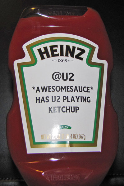 Big announcement today from @U2: In an effort to extend our worldwide reach, we’re formally launching a line of branded products with our web site’s name and/or logo. The first product is shown here: @U2 branded Heinz ketchup. It’ll be available in supermarkets near you beginning next month.